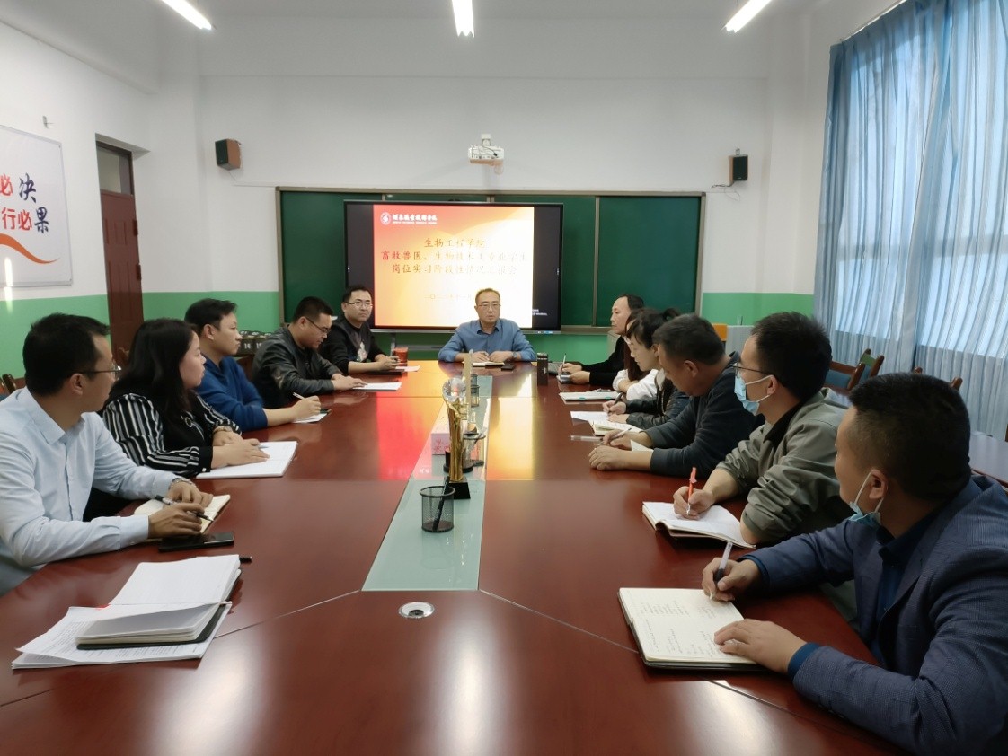 为全面掌握2020级畜牧兽医、药品生物技术类专业学生岗位实习情况,进一步规范和加强学生岗位实习管理,做好疫情防控常态化下的学生岗位实习工作, 11月2日下午,生物工程学院召开岗位实习阶段性情况汇报会,会议由生物工程学院党支部书记、院长柳立新主持。