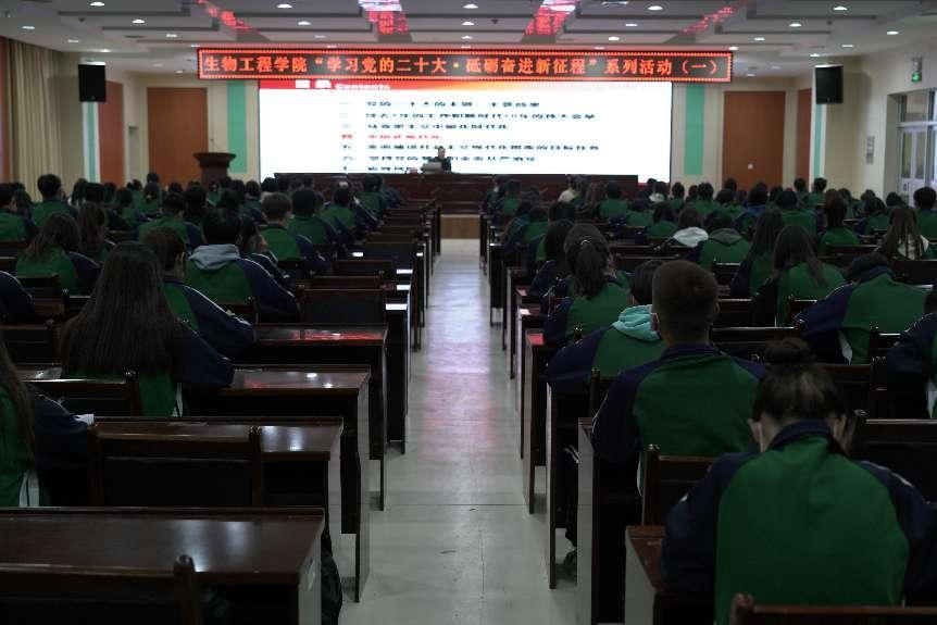 2022年11月10日晚,为深入学习贯彻党的二十大精神,积极引导广大青年学生学好、学懂、学透党的二十大精神,生物工程学院特邀请学校党委书记、校长易志军在图书馆4楼会议室做《全面把握中国式现代化的丰富内涵》为主题的党的二十大精神宣讲。生物工程学院入党积极分子和学生代表近200人参加本次宣讲大会。