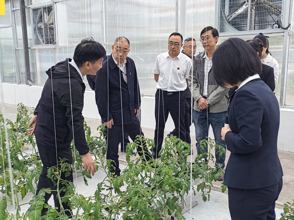 喻景权院士在现代农业技术中心认真察看轻简自控无土栽培SAS技术的具体生产实施和设施技术的推广应用。喻景权院士详细讲解并亲自示范指导轻简自控无土栽培SAS技术的应用,通过单行密植、水肥一体化供给、肥药一体化调配、温室智能化环境调控等技术集成提升现代农业生产效益。喻景权院士同时察看了实践教学示范区的水培床、A字栽培架、营养液供给设备和水净化处理设备,对比分析不同水处理设备使用效率的差异,对水培营养液循环流动提出改进建议。目前,学校现代农业技术中心应用新技术栽培的四个番茄品种,主要通过设备分时运行、水分输入管理、营养液浓度调配、吊秧精准控制等核心技术,实现基质用量少、水肥精准、用工节俭的节能高效戈壁温室农业生产示范。