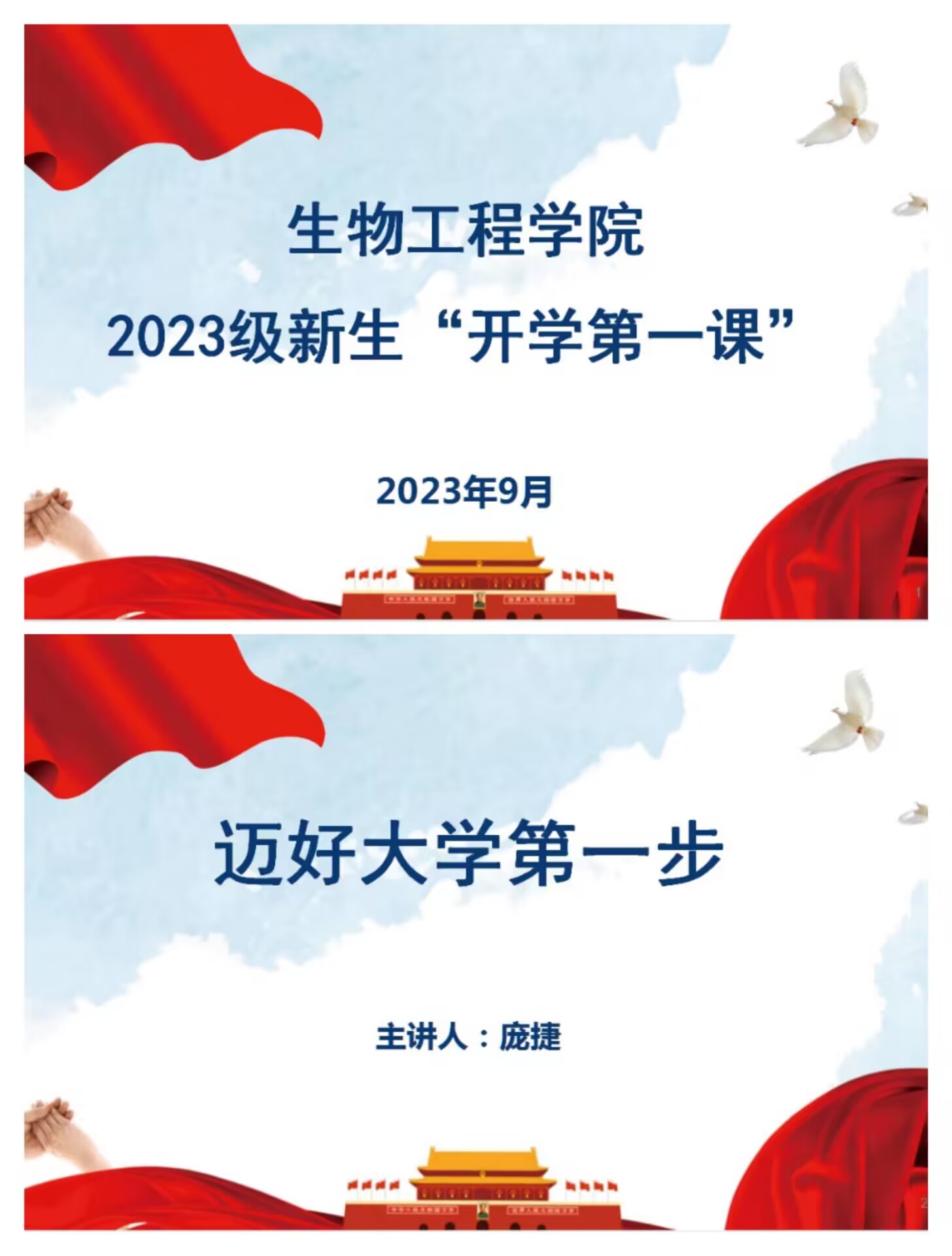 最后,庞捷对全体新生提出三点希望:要珍惜时光,做一个不负韶华的人;要懂得珍爱,做一个有情怀的人;要做到尊重,做一个品质高洁的人。期待同学们继续传承和续写生物工程学院的荣光,珍惜青春时光,不负韶华,在这里收获知识,收获技能,收获友谊,收获成长!