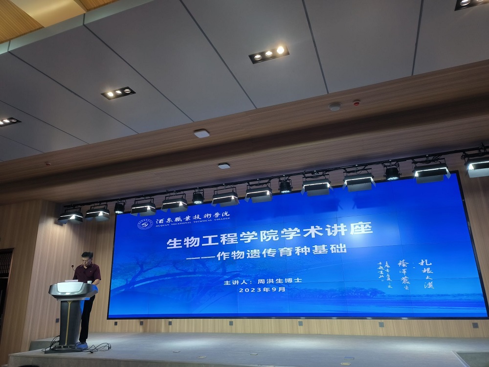 2023年9月18日下午4 : 50,酒泉职业技术学院特聘教授、酒泉特色作物种业研究院院长、酒泉同庆种业有限责任公司董事长周洪生博士,在弘毅楼C座学术报告厅作了“作物遗传育种基础”学术讲座。生物工程学院现代农业系2021级、2022级种子生产与经营专业、现代农业技术专业学生及全体教师、酒泉同庆种业有限责任公司部分员工,听取了本次讲座。