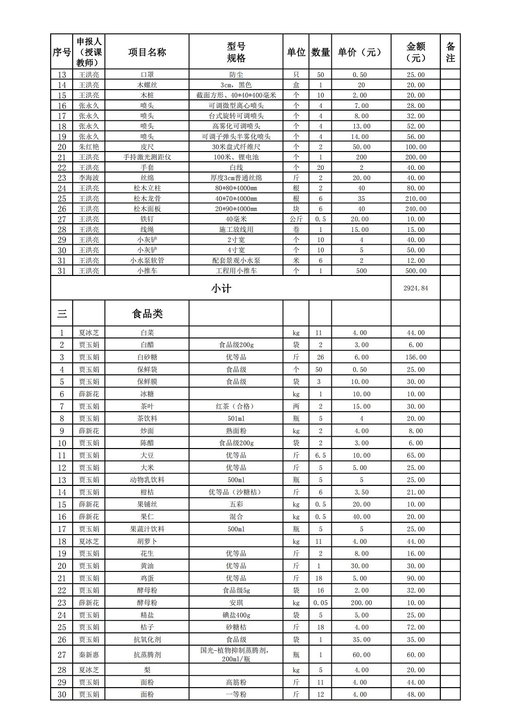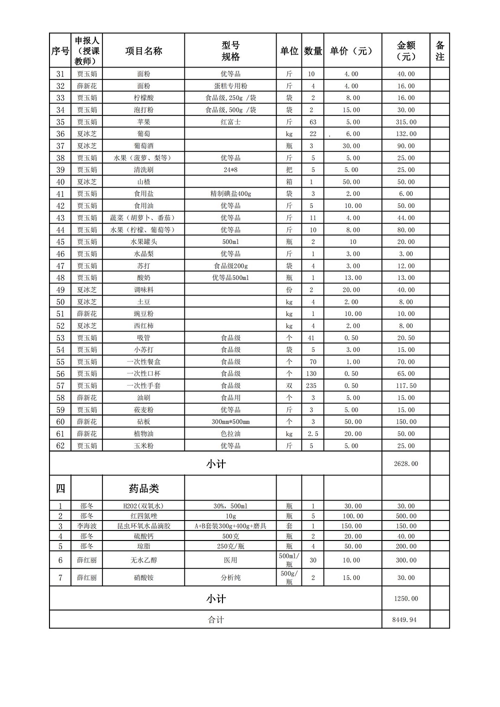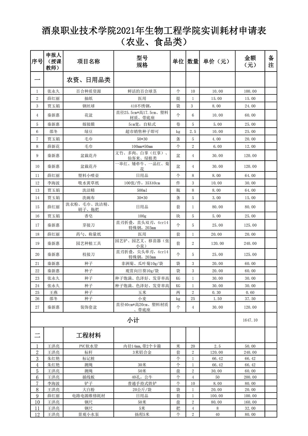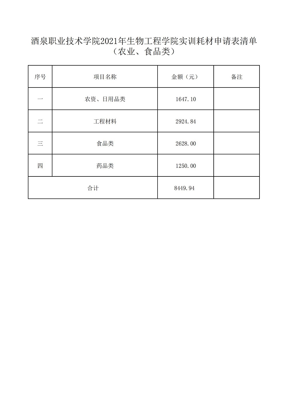生物工程学院 2021-2022学年第一学期实训耗材计划
