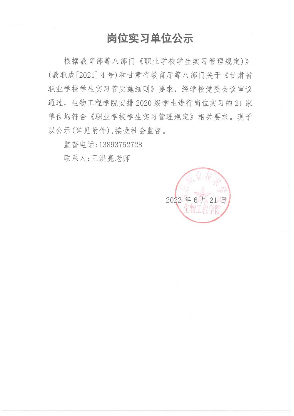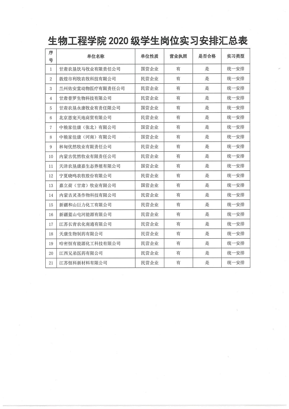 岗位实习单位公示