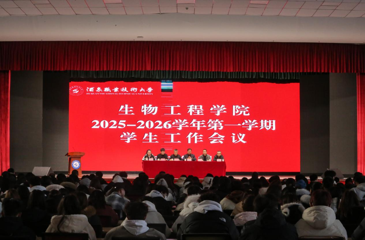 为加强新学期学生教育管理工作,严明校纪校规,培育优良学风,营造安全、文明、健康、和谐的育人环境,12月12日下午,生物工程学院在胡杨文化活动中心组织召开了2025-2026学年第一学期学生工作大会。学院党支部书记、院长张涛、副院长王洪亮、副院长张又元、团委书记张超、全体辅导员班主任及各班级学生干部、学生代表参加了会议。会议由张又元主持。