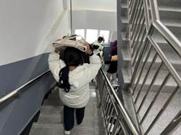 随着警报声的响起,演练正式开始。正在上课的师生们迅速反应,按照预先学习的避震方法,迅速躲在课桌下,用书包等物品保护好头部,避免被掉落的物品砸伤。在震动稍弱后,老师们立即组织学生们按照预定的疏散路线,有序地向操场等空旷地带撤离。学生们用手护住头部,沿着楼梯快速而有序地前进,没有出现拥挤、踩踏等情况。