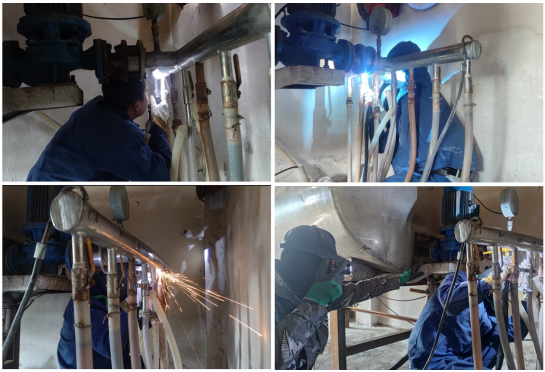 在修复现场,专业老师详细了解设备带电和承压情况,彻底排除现场动火安全隐患,指导学生开展修复工作。在修复过程中学生熟练连接焊接设备,调试焊接参数,清除裂纹周边水渍,仔细打磨裂纹周边铁锈、油污,采用小电流、断弧焊,防止烧穿和产生焊接气孔,严格控制修复温度,避免应力增大、裂纹扩展。在修复过程中同时发现5处潜在锈蚀位置,一并完成修复。现场空间狭小,学生反复寻找最佳修复位置,经过3个小时的焊接、检验、打磨、打压验证,最终圆满完成了修复任务,解决了企业的用水问题,保障了企业的正常生产、生活。修复过程中,专业教师详细记录修复工艺,收集修复相关资料,为后续课程建设储备典型实践案例。