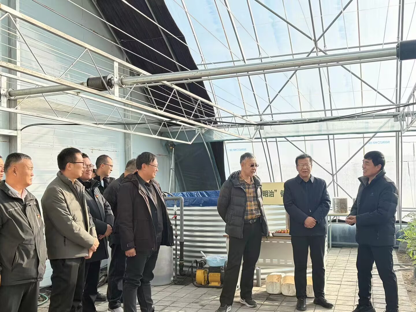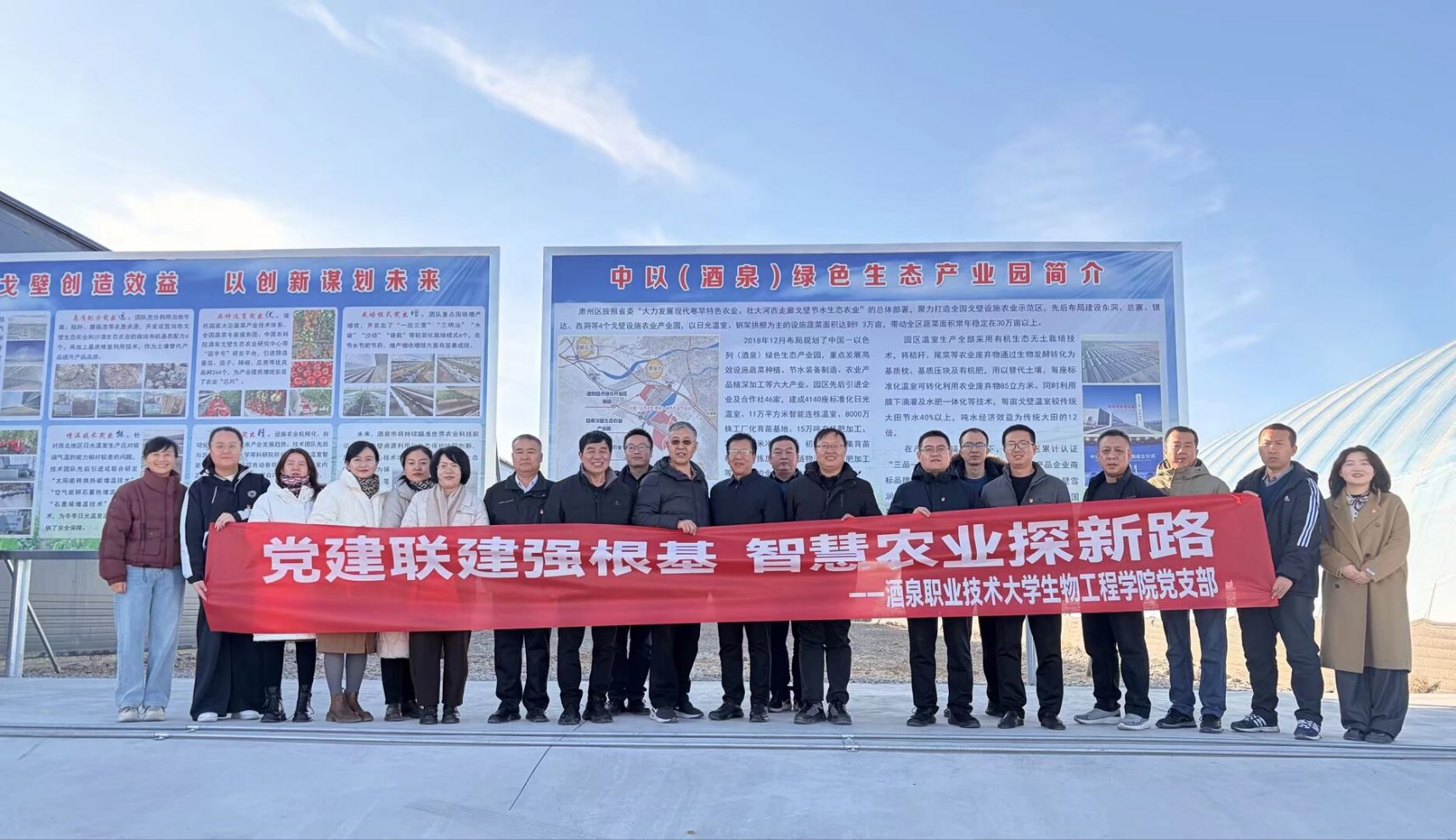 为深入贯彻落实新时代党的建设总要求,推动党建与业务工作深度融合,2025年12月3日下午,生物工程学院党支部联合酒泉市农技推广中心党支部,组织党员赴中以(酒泉)绿色生态产业园开展“党建联建强根基,智慧农业探新路”主题党日活动。学校党委委员、副校长王金明、中国农科院蔬菜花卉研究所研究员余宏军受邀出席活动,双方党员代表共计20 余人参加。