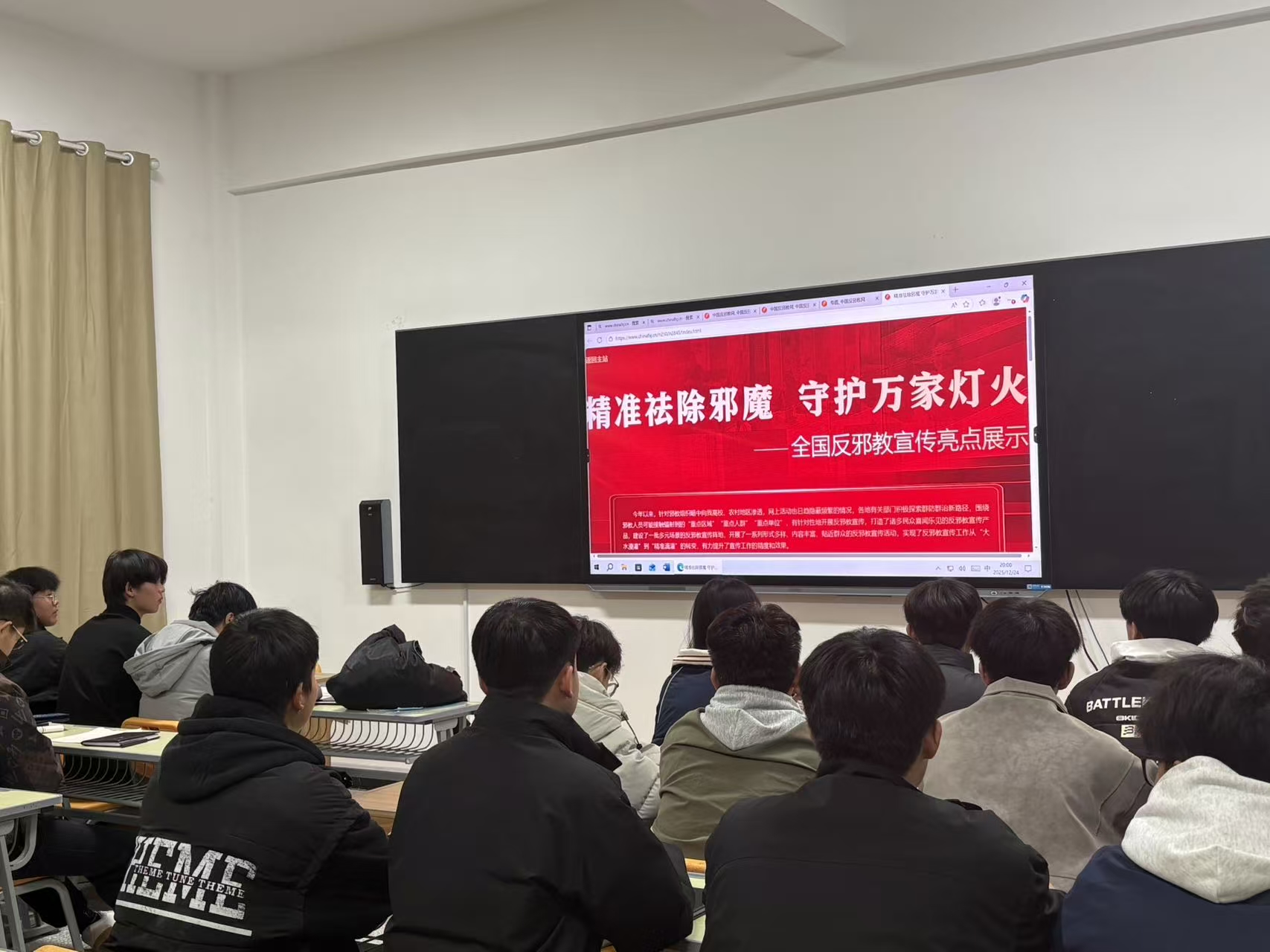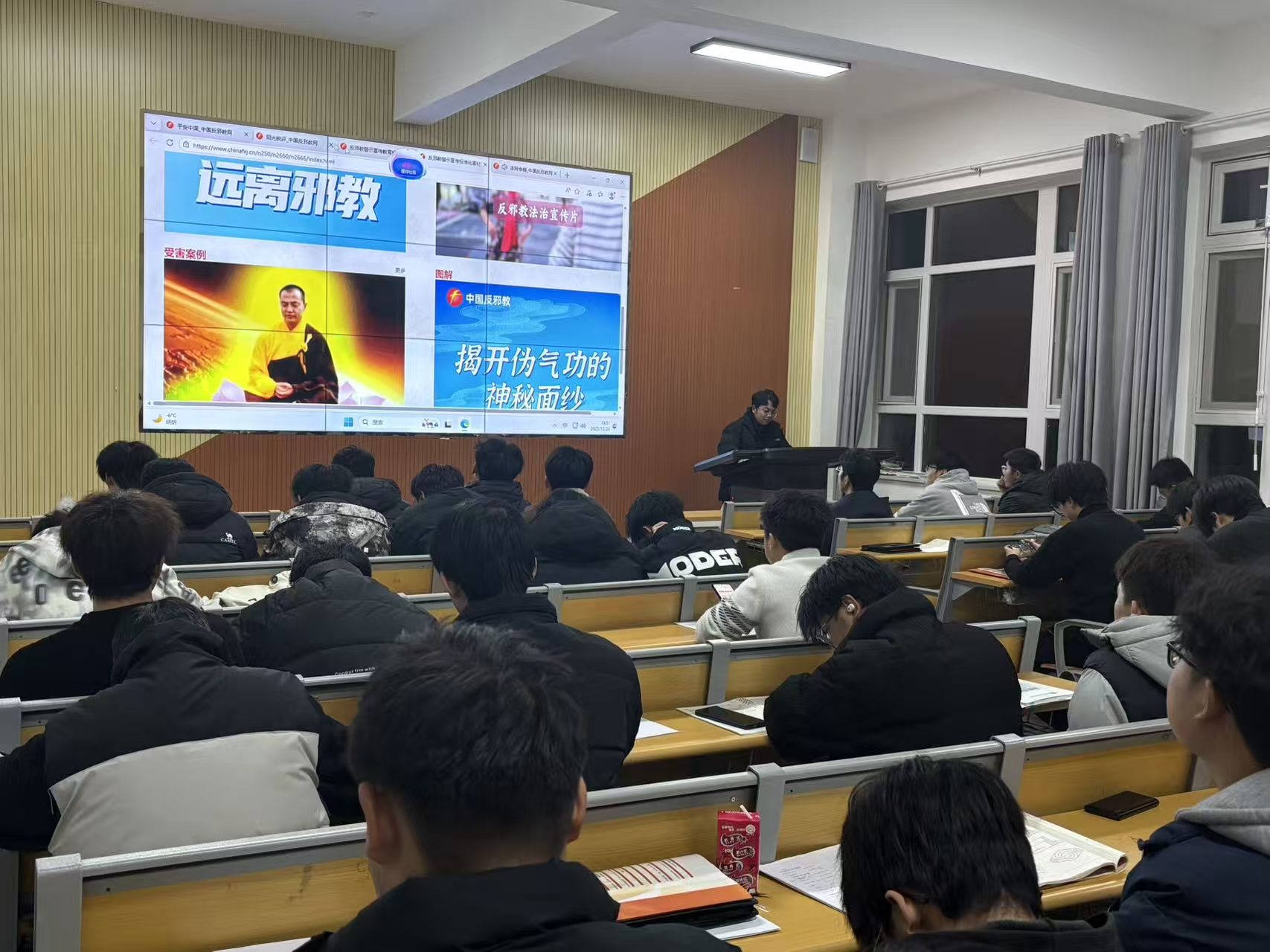 本次活动采用“主题班会+线上答题”相结合的形式开展。主题班会上,同学们集中观看“中国反邪教网” 发布的警示教育资料。通过对真实案例的深入学习与科学剖析,大家进一步认清了邪教的本质特征、现实危害与欺骗手段,切实树立起崇尚科学、尊重法治、珍爱生命的思想观念。提升了主动甄别邪教、坚决抵制邪教侵蚀的意识和行动能力。班会结束后,学院同步组织学生参与“反邪教知识云平台”线上答题活动,以检验并巩固学习成效,引导青年学子自觉筑牢反邪教思想防线,主动传播科学思想、弘扬社会正能量。