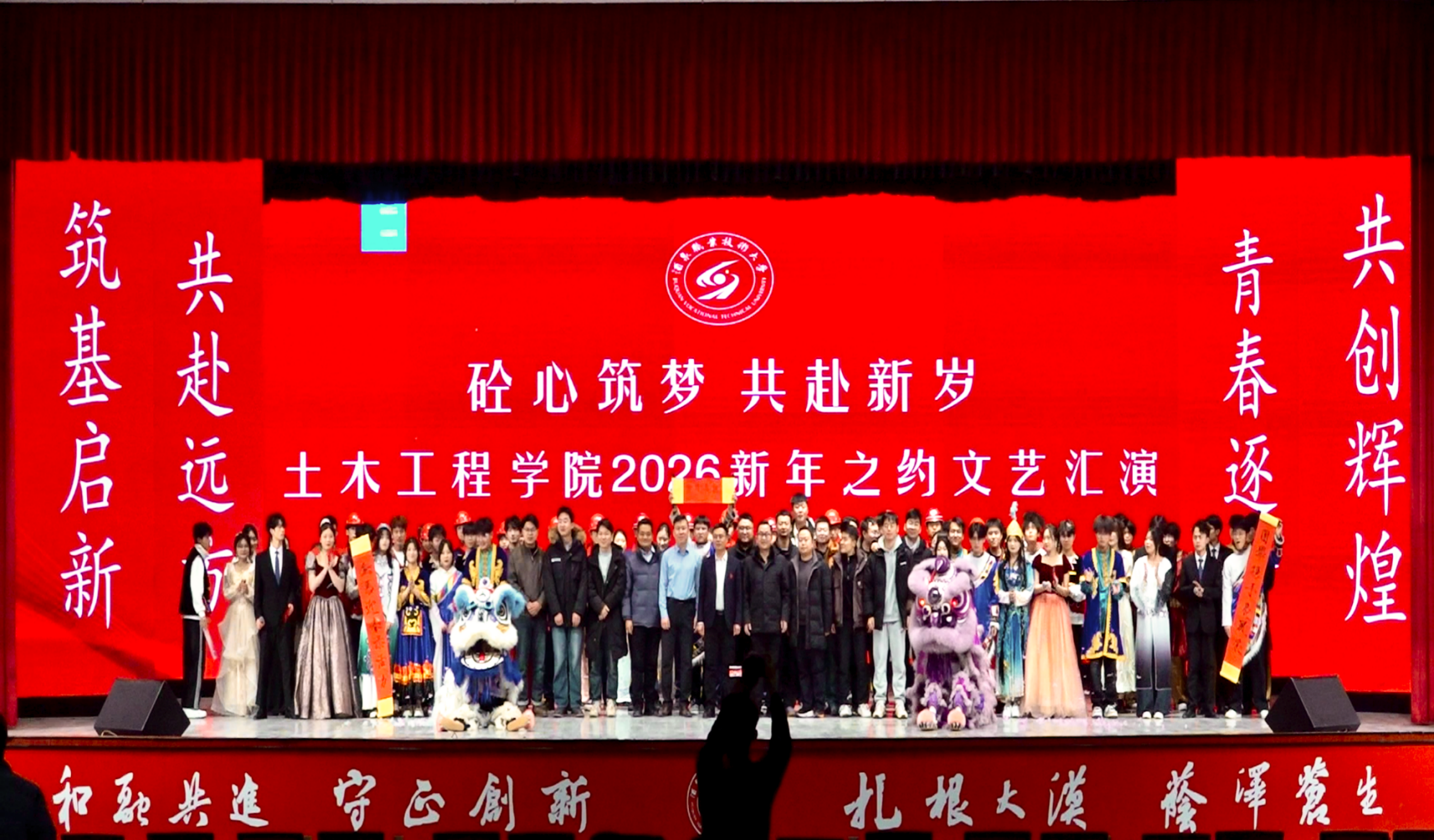 整场晚会匠心独运,分为“龙马踏歌·辞旧迎新”“匠心策马·青春建功”“携手奔赴·共谱新篇”三大篇章,融合现代舞蹈、传统舞狮、诗歌朗诵、情景剧等多种艺术形式,生动呈现了土木学子不仅精于专业、更兼具人文素养的全面发展风貌。同学们通过自编自演的节目,将工程人的严谨务实与青春梦想有机交融,展现了课堂知识内化于心、外化于行的成长自觉,体现了学院在推进“三全育人”过程中注重文化浸润与实践涵养的育人导向。