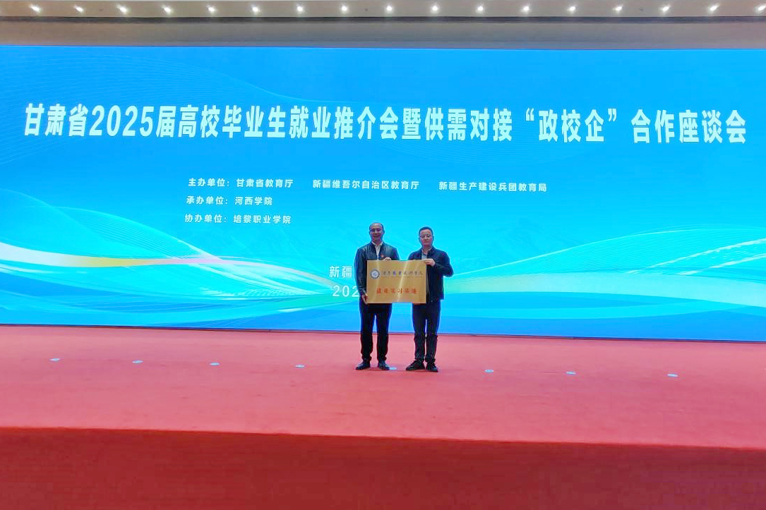 会上,杨洁围绕办学特色、毕业生就业情况和人才优势等方面做了推介发言,并为新疆兰石重装能源工程有限公司、新疆昆玉钢铁有限公司两家用人单位授予了“就业实习基地”牌匾。