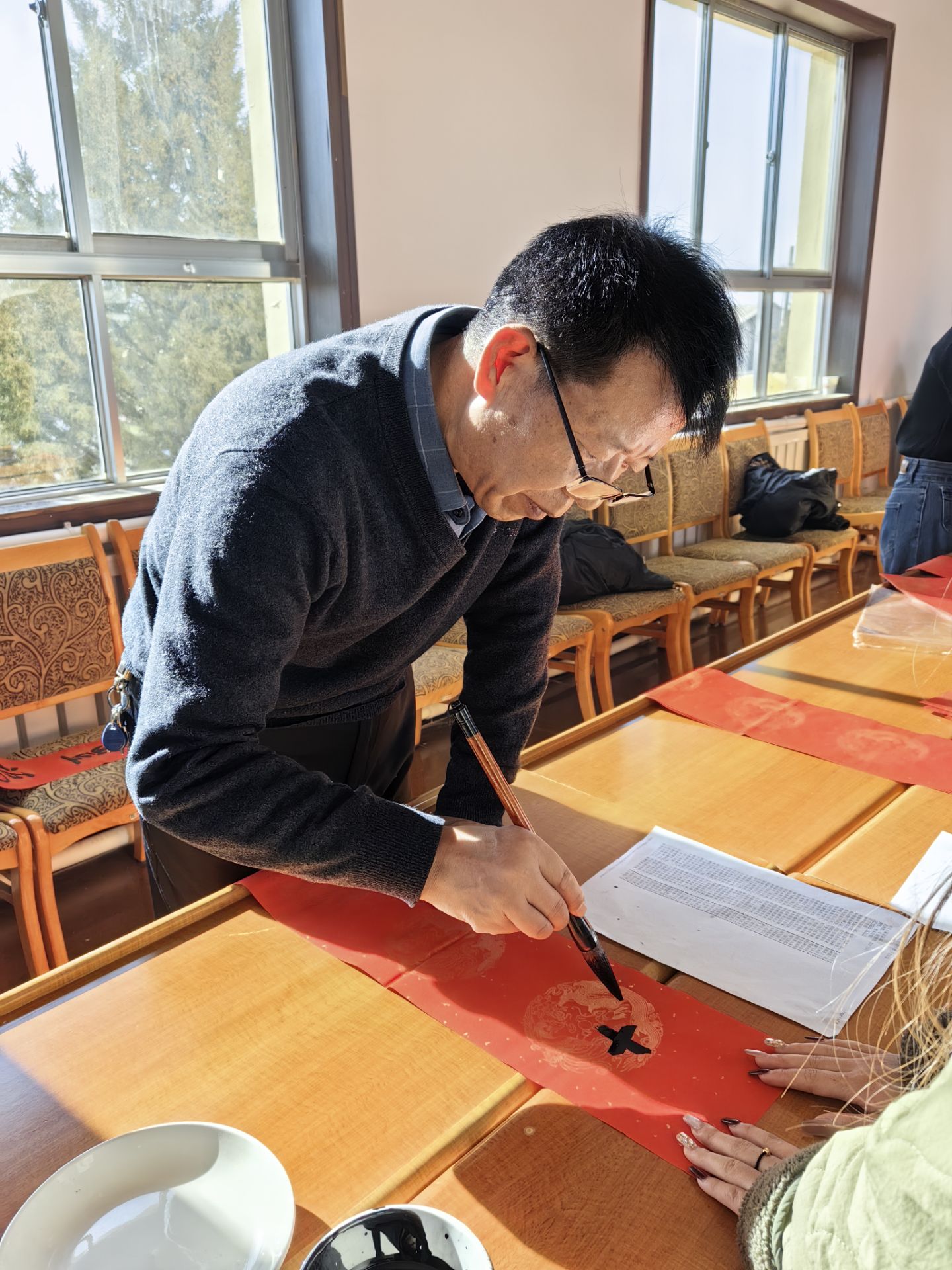 在丁家闸的村民们早早就来到活动地点等候,拿到一副精心挑选的春联后赞不绝口:“还是手写的春联更有人情味!”“以前都是去买印刷好的春联,今天老师们来我们这儿写春联,不仅现场领略了书法家的风采,还得到了一份‘特别定制’的春联,非常开心!”小坝沟村民们也喜笑颜开地向大家展示着他们手里的春联。(信息员:培训处 董金玲)