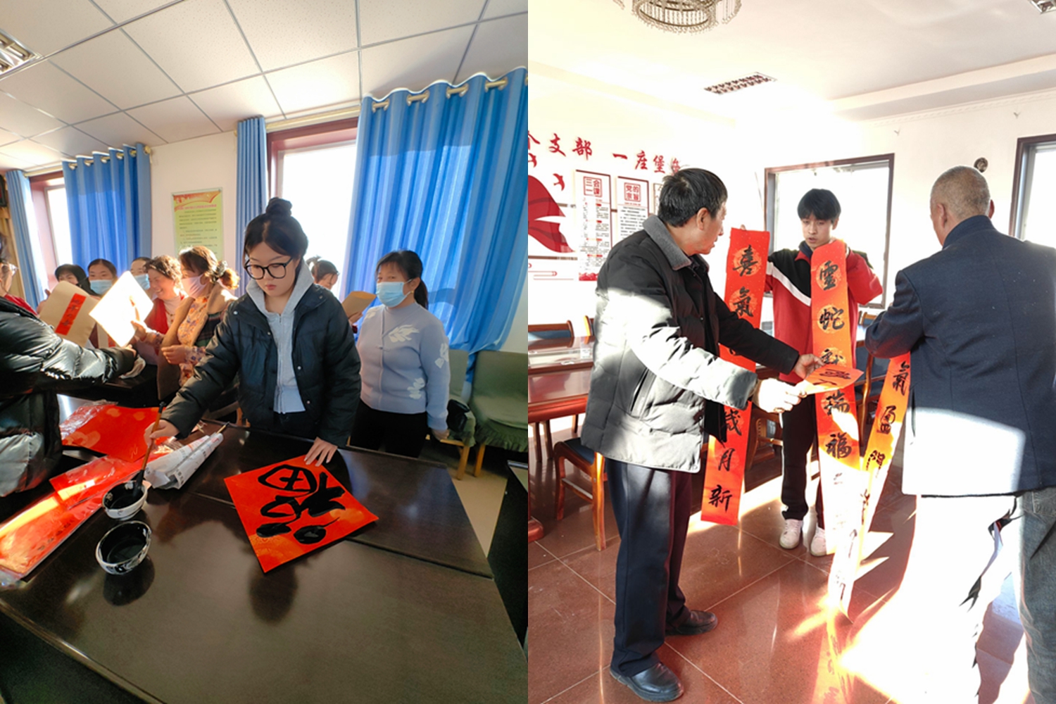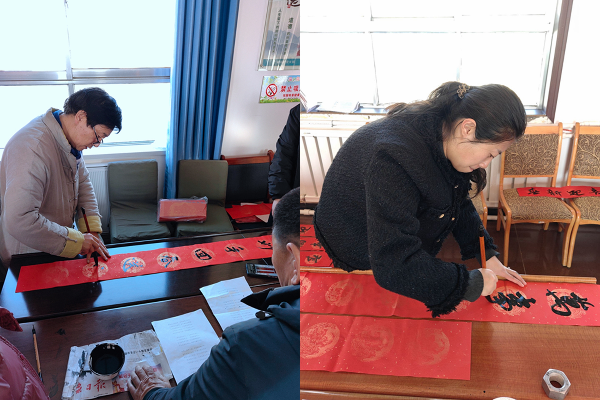 活动现场,书法老师们现场挥毫泼墨,龙飞凤舞、笔走龙蛇,一幅幅寓意吉祥、充满美好祝福的春联在行云流水间应运而生。村民们有的簇拥在桌前,认真观看春联书法创作,有的精心挑选自己心仪的内容,有的互相讨论春联的蕴意,领略书法的魅力,感受浓浓的年味。