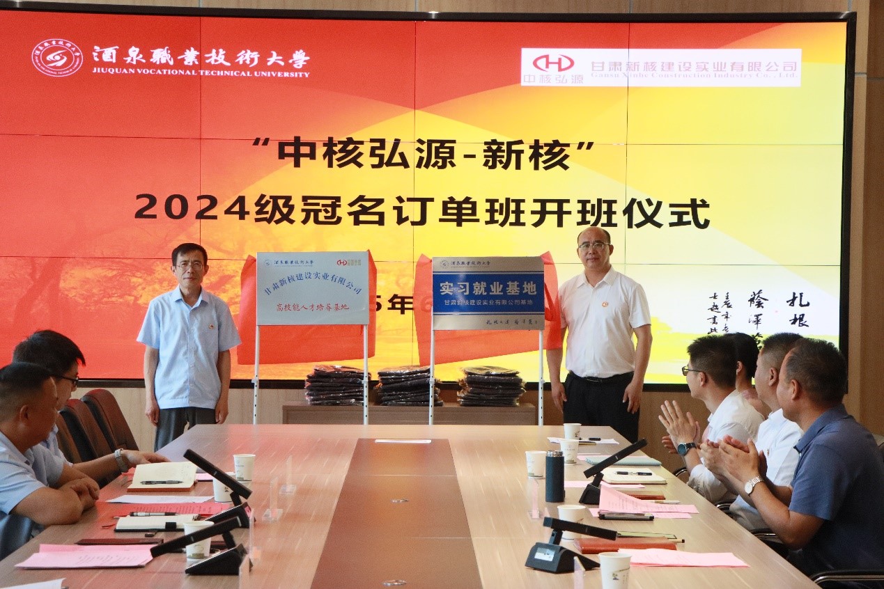 双方共同为甘肃新核建设实业有限公司人才培养基地、酒泉职业技术大学实习就业基地揭牌,企业代表为订单班同学发放了工装并向订单班授旗,订单班学生代表毛著鸿发言表示将努力学习专业知识,提升实践能力,不负期望,勇担使命。