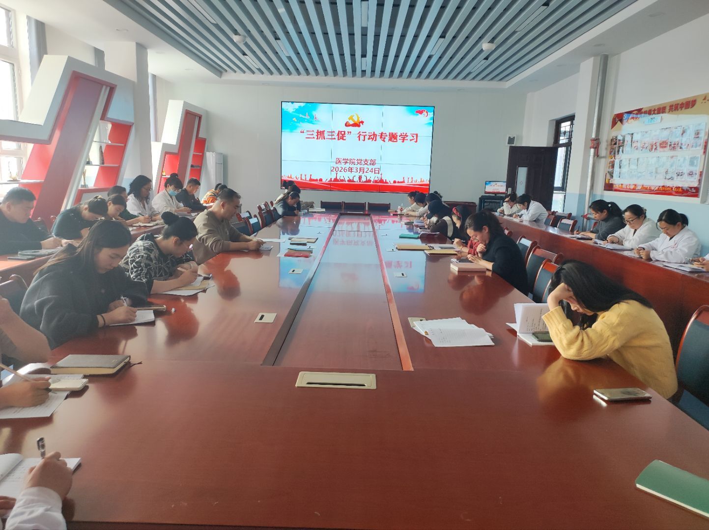 会上,与会人员集体学习了《凝心聚力显成效 乘势而上开新局——一论纵深推进“三抓三促”行动》(《甘肃要闻》)及《“三抓三促”行动应知应会内容》,并结合医学人才培养、教学科研、临床实训、师德师风建设等重点工作,对行动内涵与实践要求进行了深入解读。